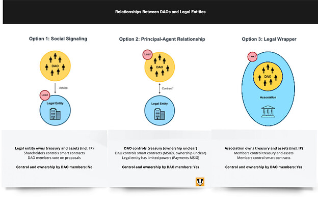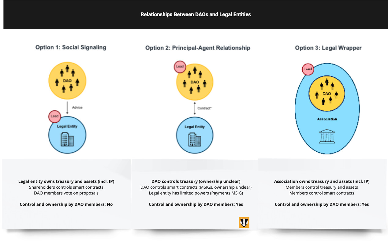 Here’s a summary of the possible relationship archetypes between DAO’s and legal entities.